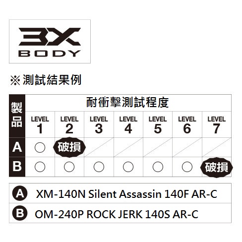 採用全新素材與強化設計組合誕生的3X BODY魚身設計,和一般海鱸釣用米諾相比,耐衝擊性達到3倍以上,為針對地勢較高的磯場等嚴峻環境設定使用所開發的路亞。