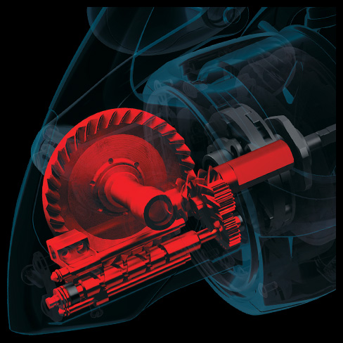 驅動齒輪的大口徑化、中柱齒輪與驅動齒輪的最佳配置、中柱齒輪的兩處培林支撐。穩固的齒輪咬合在面臨負重時亦能維持輕盈的捲線操作。
