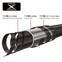 將互為反向纖維的碳纖布於最內層與最外層使用,然後以X狀向上包覆,大幅提升了左右向的扭力剛性。最先進的鯽魚竿不僅僅只有力度而已,而是能更讓人安心操作。