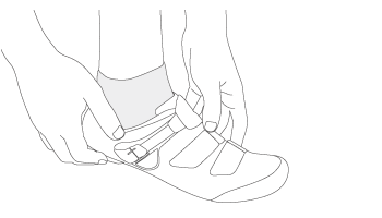 腳穿入車鞋。後跟穩固地放置在後跟杯。繫好扣帶,調整扣帶和魔鬼氈至使用者最舒適的位置。