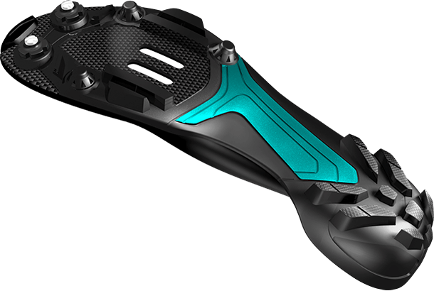 鞋底前端設計裝配理想的鞋釘和防滑塊組合,完美的設計將抓地力最大化。 開放式除泥設計讓泥沙和碎屑不容易停留,車鞋和踏板維持輕量和力量傳輸的效率。