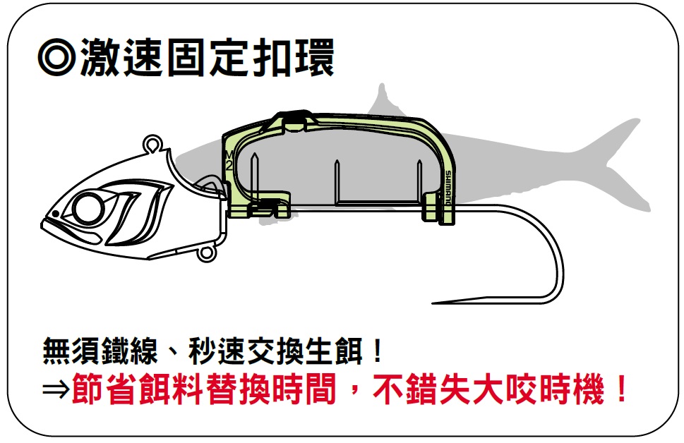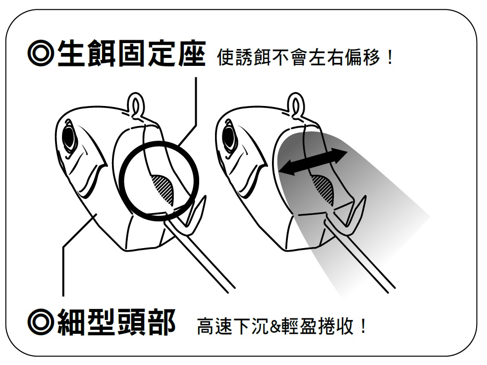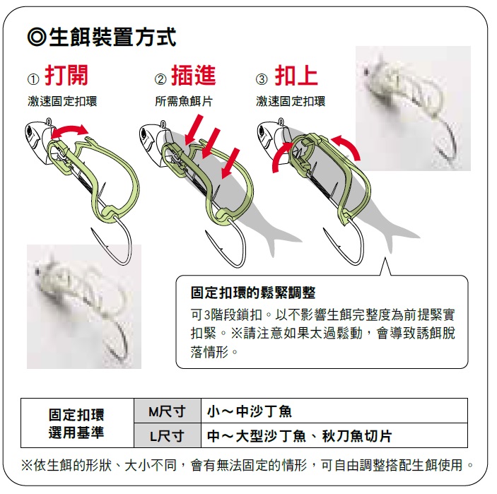 ![]() 生餌裝置方式 ※依生餌的形狀、大小不同,會有無法固定的情形,可自由調整搭配生餌使用。 |