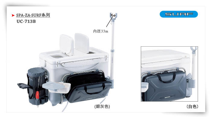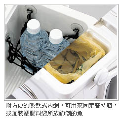 | 手把 | 背帶 | 入魚口 | 保護裝置 | 水栓 | 隔魚板 | 輔助把 | 輔助包 | 橡皮腳 | 取餌箱 | 線杯收納盒 | 內網 | 竿架 | |||||||||||||