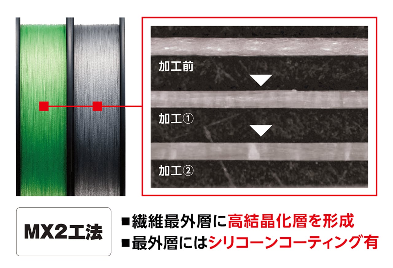MX2工法是在PE釣線的纖維表面形成高結晶化層,並在最外層施以SILICON塗層使水分容易彈開,更易使用。